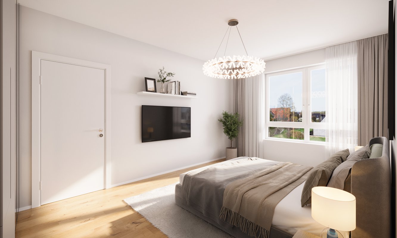 Die Drei-Zimmer-Wohnungen bestechen durch eine klare Grundrissgestaltung – mit lichtdurchflutetem Wohn-, Ess- und Kochbereich. Die Bäder werden mit einer bodengleichen Dusche sowie Badobjekten namhafter Hersteller ausgestattet. Ein Hauswirtschaftsraum bietet Platz für Vorräte und Anschlüsse für Waschmaschine und Wäschetrockner.